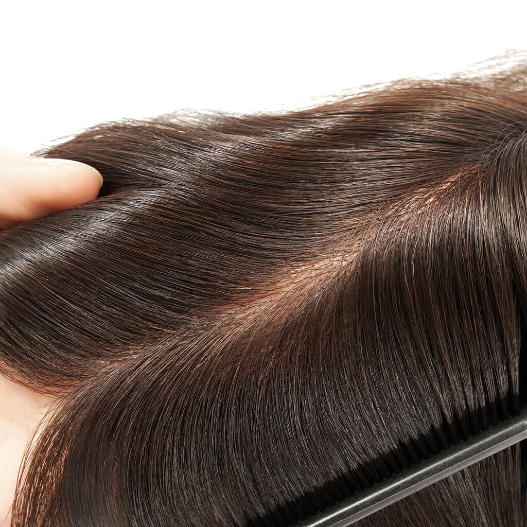 We incorporated the hair injection technique in making this master hair piece. All hair we use for it is injected into the surface of the 0.08mm skin base in medium density, allowing the hair to be 100% knot and tangle-free.