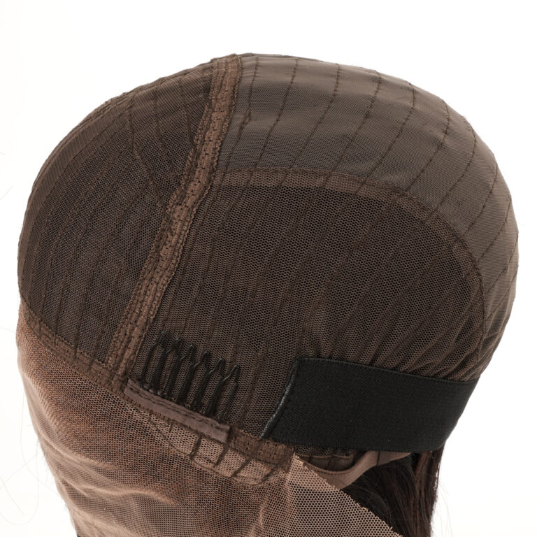 The base design of this T-part lace front wig is characterized by a handmade T-part lace front, machine-made rest, and an elastic band at the back.