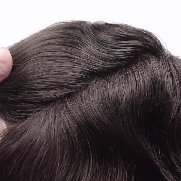 We use medium-density hair on the main area of this fine mono hairpiece. This increases the lifespan of the fine mono hairpiece and also gives good coverage.